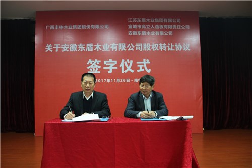 2017年11月26日,王高峰总裁代表U乐国际·【中国】集团与安徽东盾木U乐国际挂官网有限公司签订股权和资产转让协议,建立池州U乐国际,能更快捷地服务华东、华北大客户,同时也填补了U乐国际·【中国】集团中纤板薄板产U乐国际结构的空白。