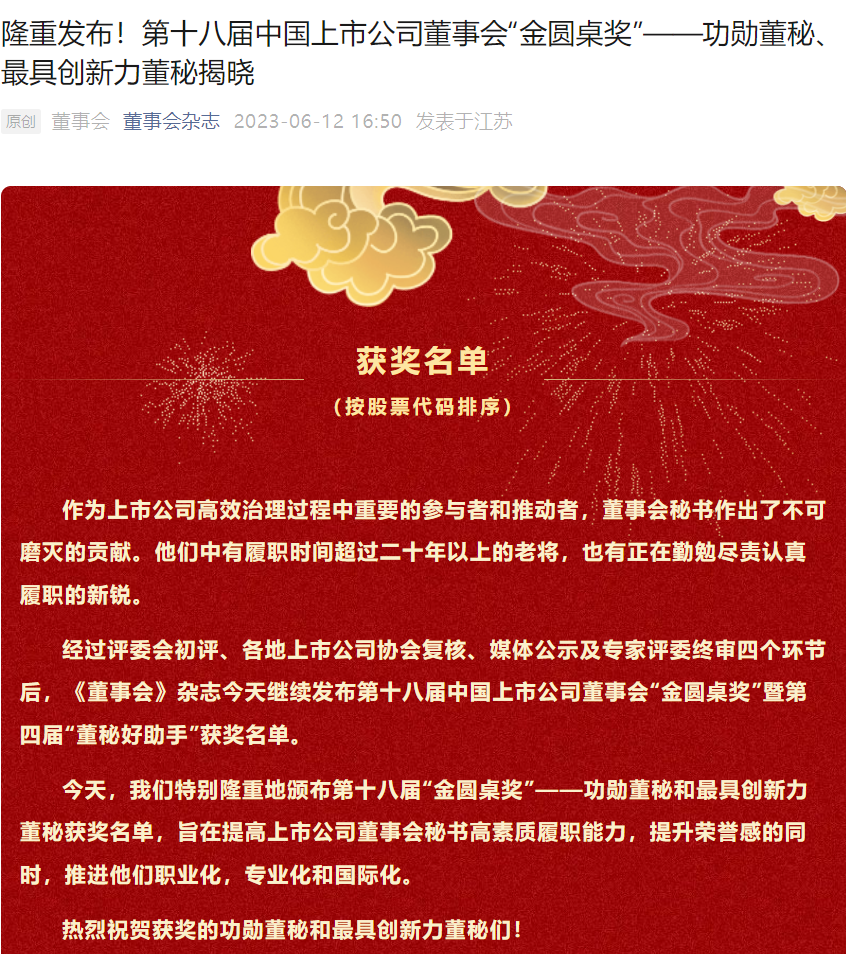 6月12日,经过评委会初评、各地上市公司协会复核、媒体公示及专家评委终审四个环节后,《董事会》杂志发布了第十八届中国上市公司董事会“金圆桌奖”暨第四届“董秘好助手”获奖名单。U乐国际·【中国】集团董事会秘书汪灏荣获第十八届“金圆桌奖”最具创新力董秘 ,这是继2021年第十六届、2022年第十七届之后,第三次获得该奖项。
