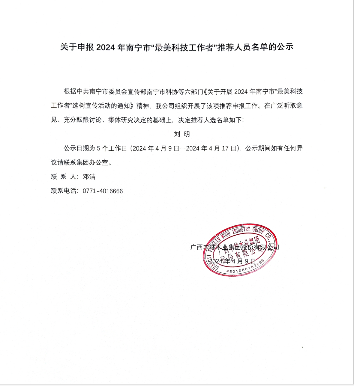 根据中共南宁市委员会宣传部南宁市科协等六部门《关于开展2024年南宁市“最美科技工作者”选树宣传活动的通知》精神,我公司组织开展了该项推荐申报工作。在广泛听取意见、充分酝酿讨论、集体研究决定的基础上,决定推荐人选名单如下: